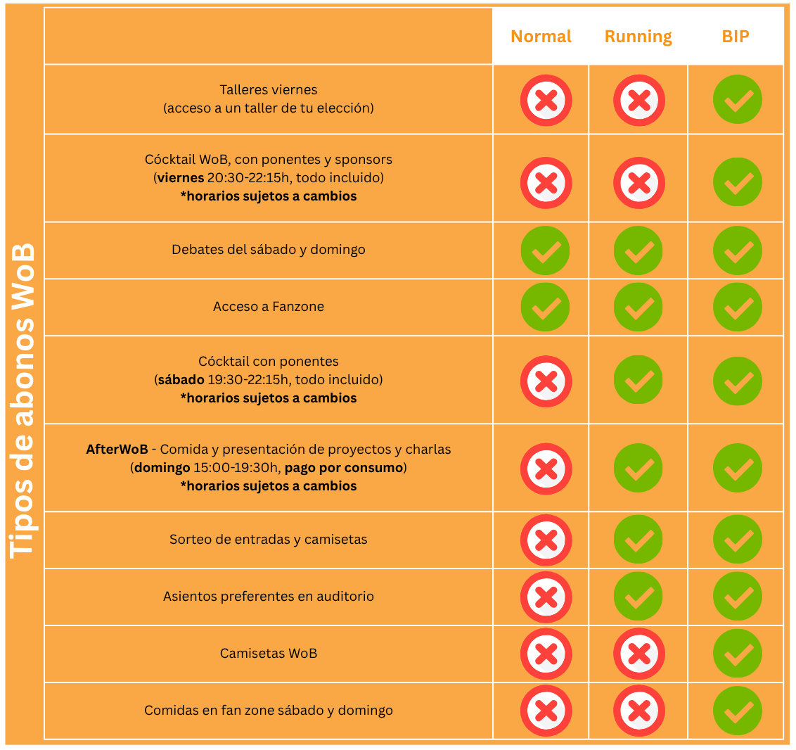 - ABONO RUNNING: Acceso a todas las charlas del sábado y domingo, acceso a la Fan Zone, acceso cocktail del sábado por la noche con catering incluido y acceso al AfterWOB del domingo con catering disponible de pago por consumo.
